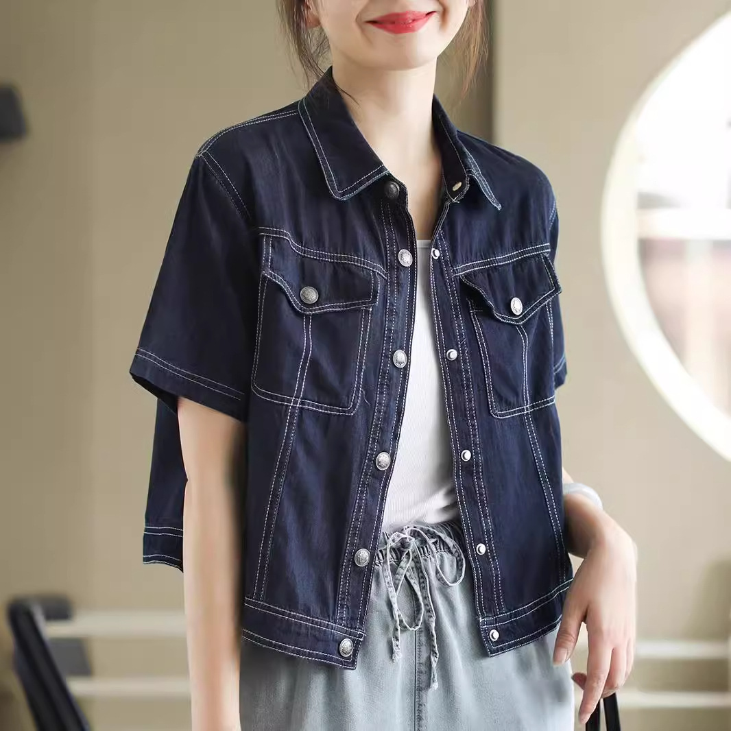 صيف جديد القطن غسلها خط أزرق داكن الدنيم قميص سترة المرأة ريترو هونغ كونغ نمط قمة قصيرة