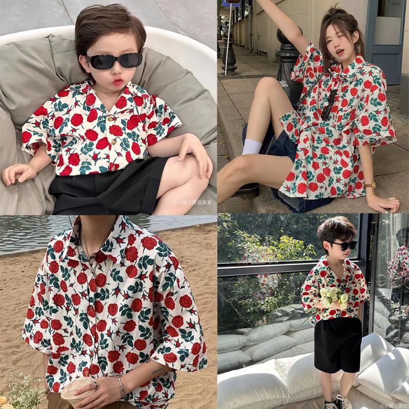 ارتفع نمط هونغ كونغ الرجعية ملابس الوالدين والطفل شاطئ البحر عطلة نمط الصيف فستان قميص عائلة مكونة من ثلاثة الأم والابن الأم والابنة الأسرة الديكور
