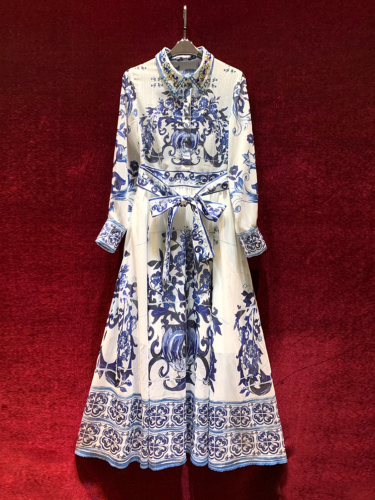 فستان اجتماعي أنيق بأكمام طويلة مع طباعة بورسلين باللونين الأزرق والأبيض