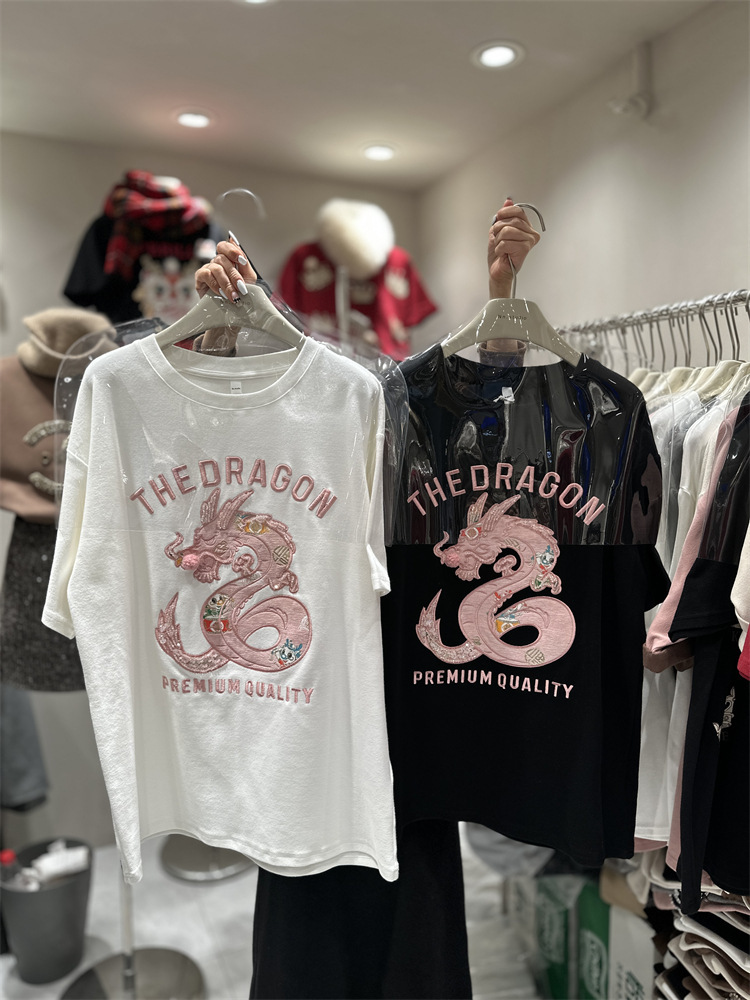 تي شيرت كبير بأكمام قصيرة للنساء 2024 أوائل ربيع جديد مطبوع عليه سنة التنين موضة وطنية قميص متوسط الطول نصف كم موضة