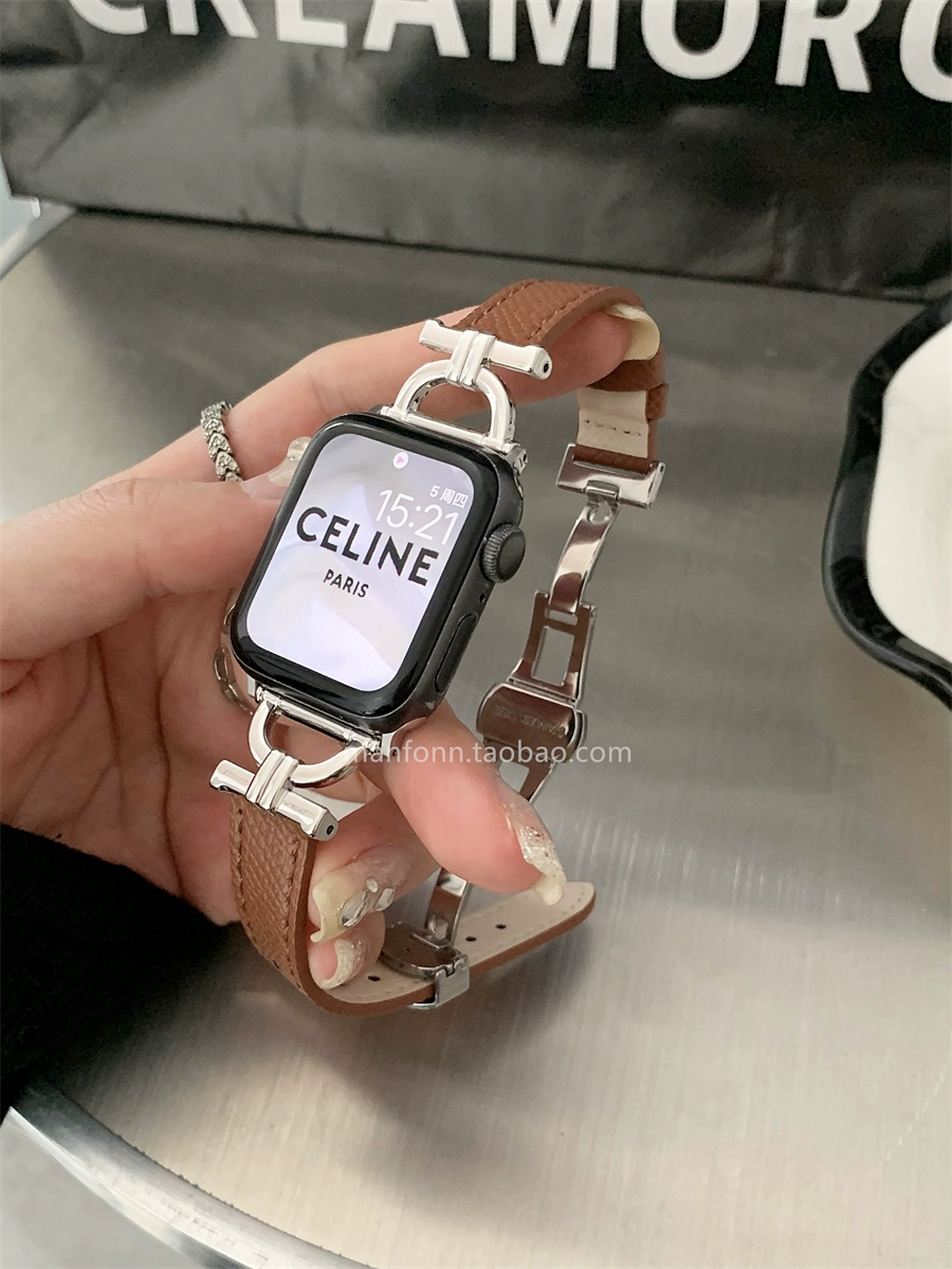 حزام مشبك الفراشة الرقيق المعدني الراقي والجلد الرجعية مناسب لـ Apple Watch 89 Generation 7654