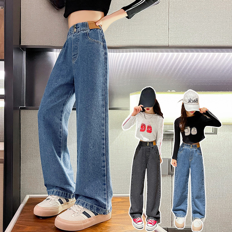 الفتيات وسم الدنيم السراويل واسعة الساق 2024 التجارة الخارجية الربيع والخريف السراويل الجديدة الفتيات السراويل الكورية غير رسمية