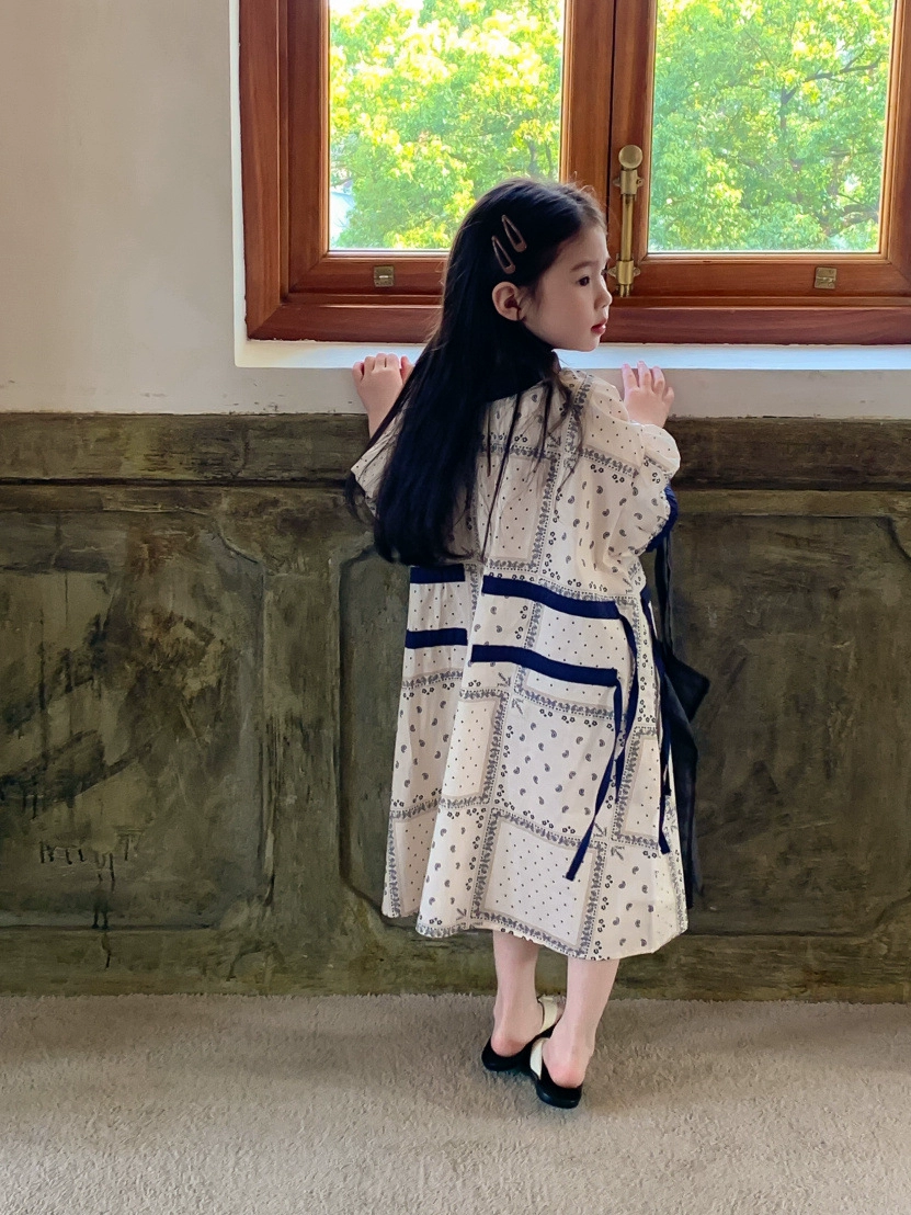 Bao Xiaoyu 2024 Summer Girl Corean Girl و Corning والوالد والطفل الأدب الأدب الأزرق والأبيض لبس القماش القطني