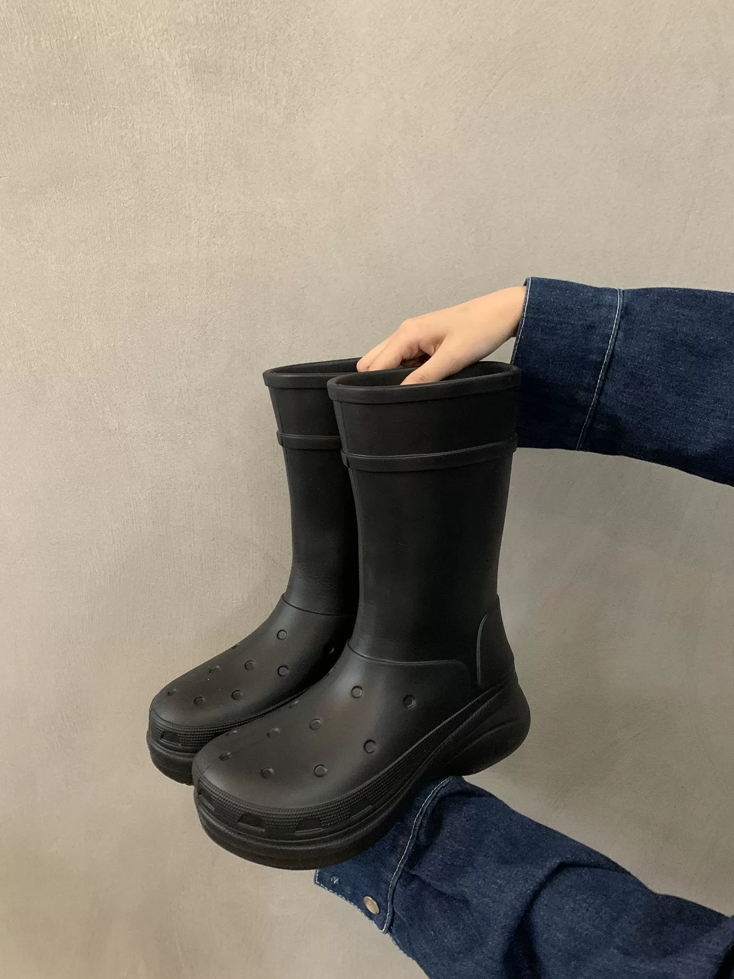 النسخة الكورية من أحذية منتصف الساق المتخصصة للنساء 2024 أحذية مارتن جديدة ذات أكمام مستديرة من الأمام أحذية المطر السوداء أحذية الفارس