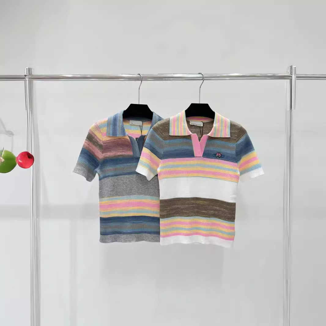 تي شيرت Gaoding Saturn Series 24 صيفي قصير أنيق بولو ذو طية صدر السترة بألوان قوس قزح مخطط محبوك بأكمام قصيرة للنساء