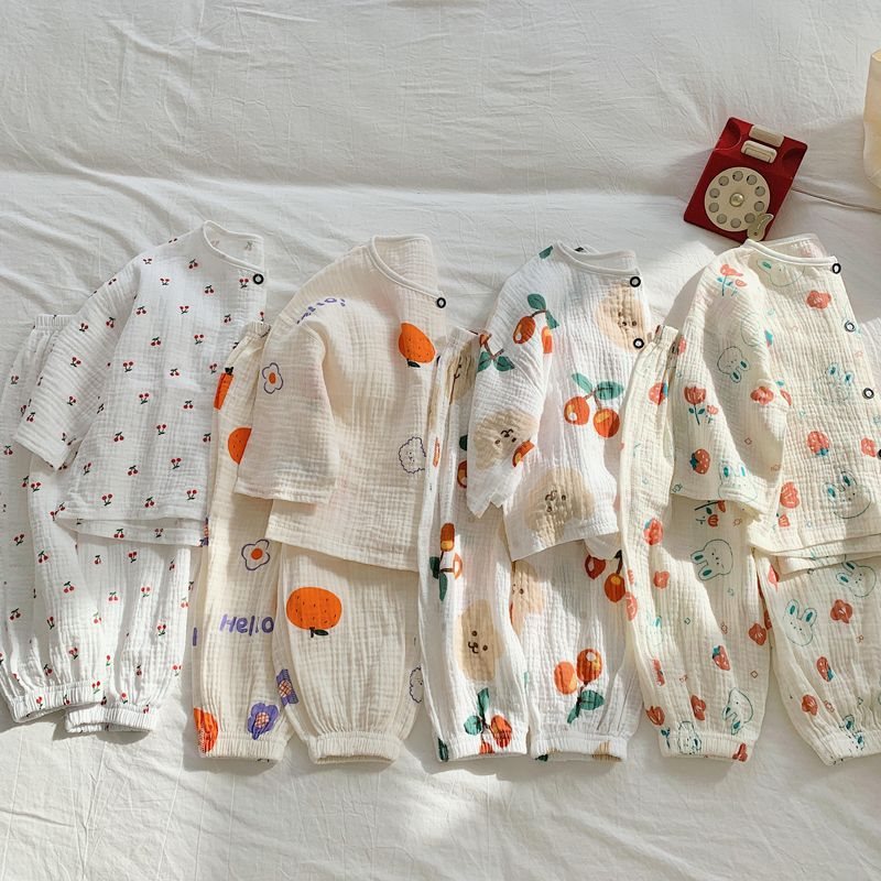 بيجامات أطفال رقيقة بطبقة مزدوجة من القطن الشاش وأكمام قصيرة ملابس منزلية قطنية للرجال والنساء بدلة أطفال مقصوصة