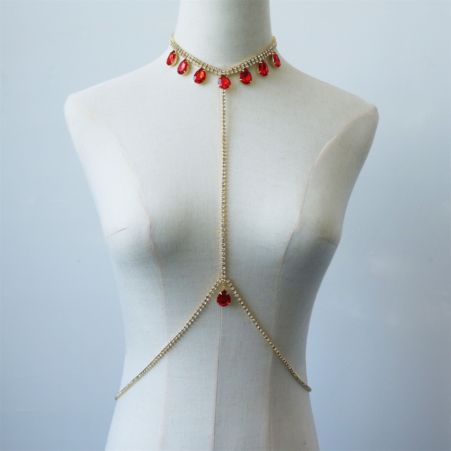 الأوروبية والأمريكية مثير الأزياء قطرات الماء الأحمر لامعة كريستال الجسم سلسلة المرأة ملهى ليلي حجر الراين الصدر سلسلة الجسم سلسلة