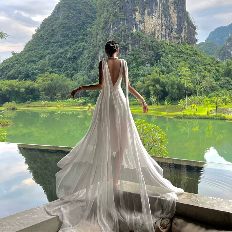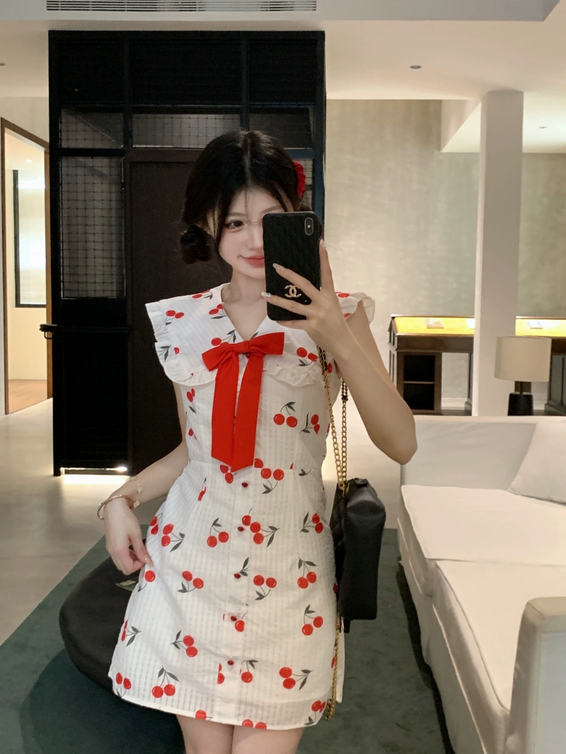 فستان فرنسي برقبة على شكل حرف V مع فيونكة صيفية للتنحيف على شكل حرف A