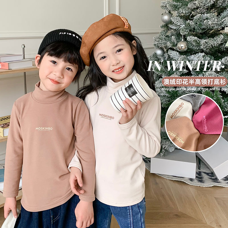 قميص قاع مخملي أسترالي للأطفال للخريف والشتاء على الطراز الكوري للأولاد والبنات تي شيرت بأكمام طويلة مطبوع عليه حروف نصف الياقة المدورة للأطفال