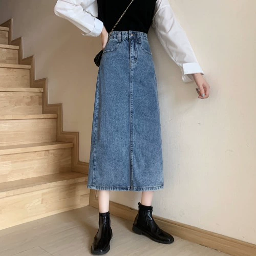 تنورة جينز كلاسيكية عالية الخصر على شكل حرف A تغطي المنشعب