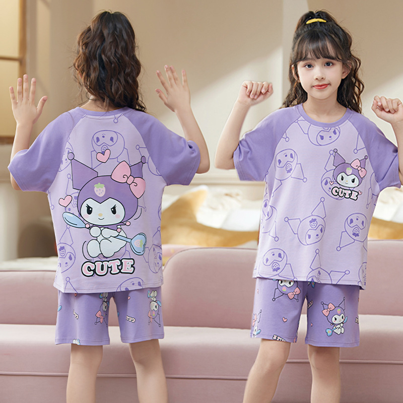 بيجامات بناتي طقم صيفي رقيق من القطن الخالص بأكمام قصيرة بيجامات أطفال بناتي صيفي متوسط وكبير ملابس منزلية كرتونية للأطفال
