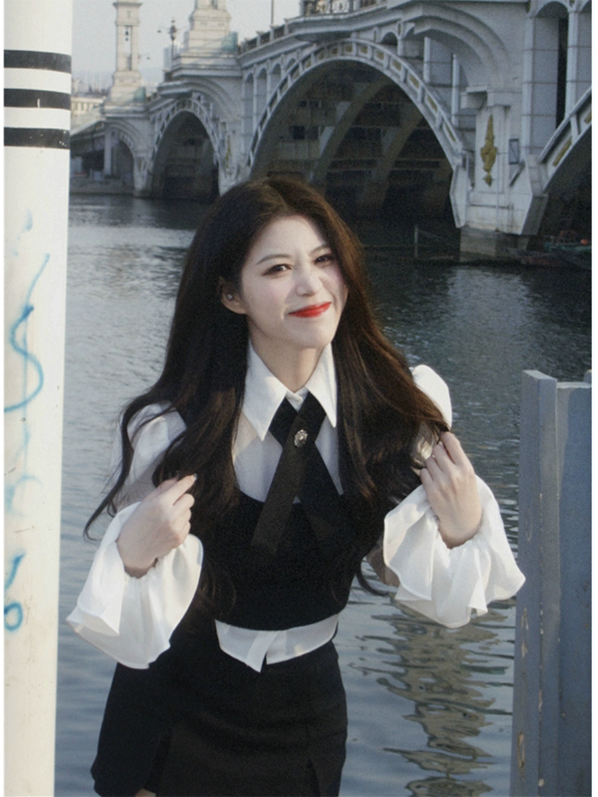 سترة بأكمام جرس، فتحة، تنورة تغطي الورك، قميص ربيعي