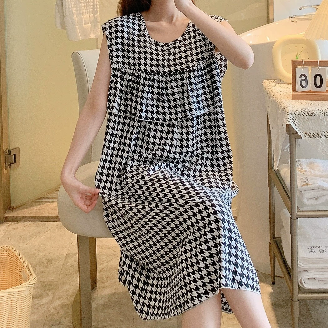 ثوب نوم صيفي مطبوع مضاد للصدمات للنساء، لطيف ولطيف، ملابس منزلية رقيقة للفتيات، تنورة كبيرة الحجم بدون أكمام من القطن والحرير