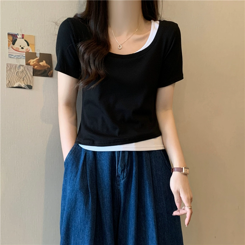 فانغ لينغ القصير القصيرة t -shirt أنثى 2023 الصيف التصميم الجديد ، متخصصة مزيفة ، اثنين من الأكمام القصيرة الرقيقة Tide Tide