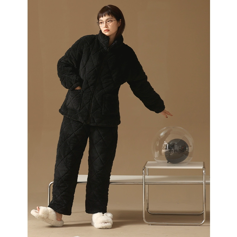 بيجامة زوجين دافئة “سميكة للغاية” للرجال والنساء، شتوي ثلاث طبقات سميكة مبطن بالإضافة إلى سترة قطنية مخملية، ملابس منزلية مخملية مرجانية