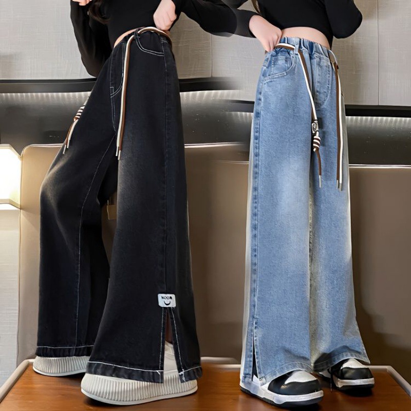 سراويل الفتيات الربيعية الجينز واسع الساق الشهير على الإنترنت 2024 النمط الكوري الجديد الصبي الكبير فضفاض المصمم السراويل المستقيمة