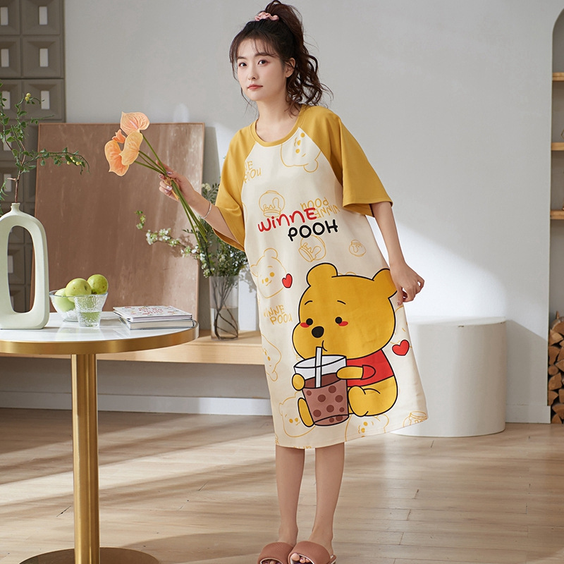 فستان نوم نسائي صيفي رقيق بنمط كرتوني لطيف وأكمام قصيرة وياقة الأميرة الجميلة فستان قطني للمنزل