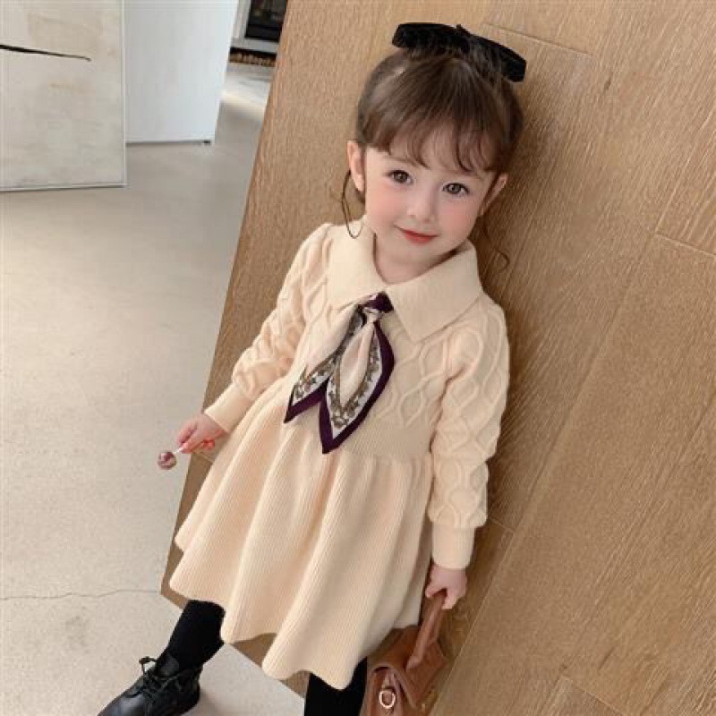 فستان أطفال بناتي للخريف نمط جديد فستان الأميرة للأطفال فستان سترة محبوك من الحرير الأبيض الكريمي الدافئ