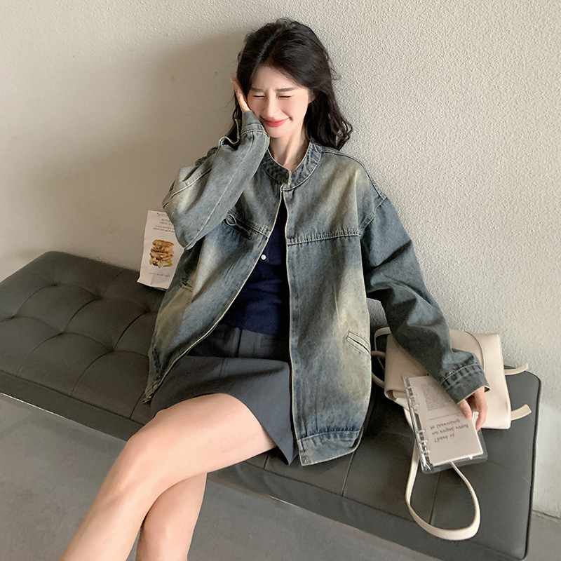 الجملة فضفاضة صغيرة الوقوف طوق قصيرة باردة أنيقة الرجعية المتعثرة تصميم عصري كل مباراة سستة جيب معطف الدنيم للنساء