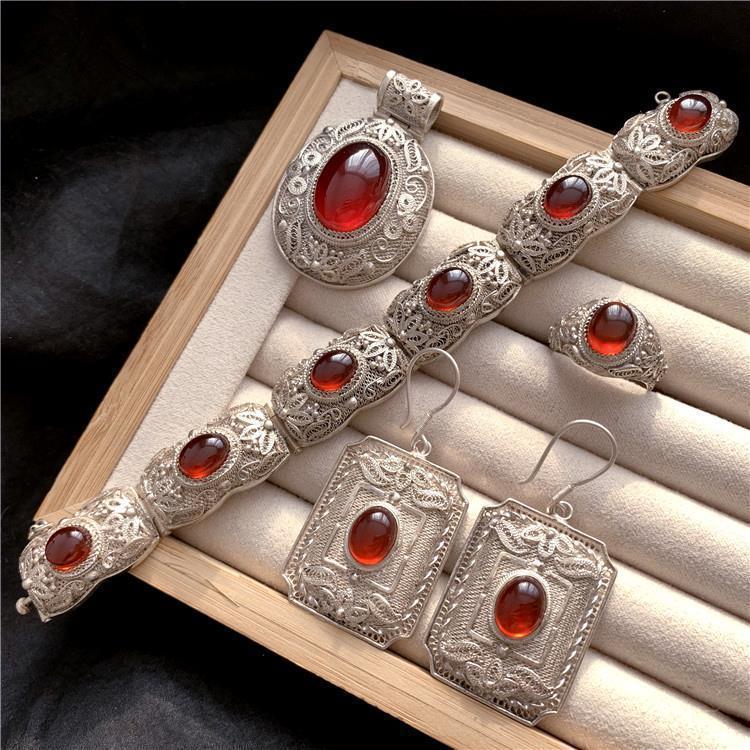 أقراط حلقية مصنوعة يدويًا من الحرير المرصع بالرمان الأحمر العتيق وسوار مكون من أربع قطع على الطراز العرقي