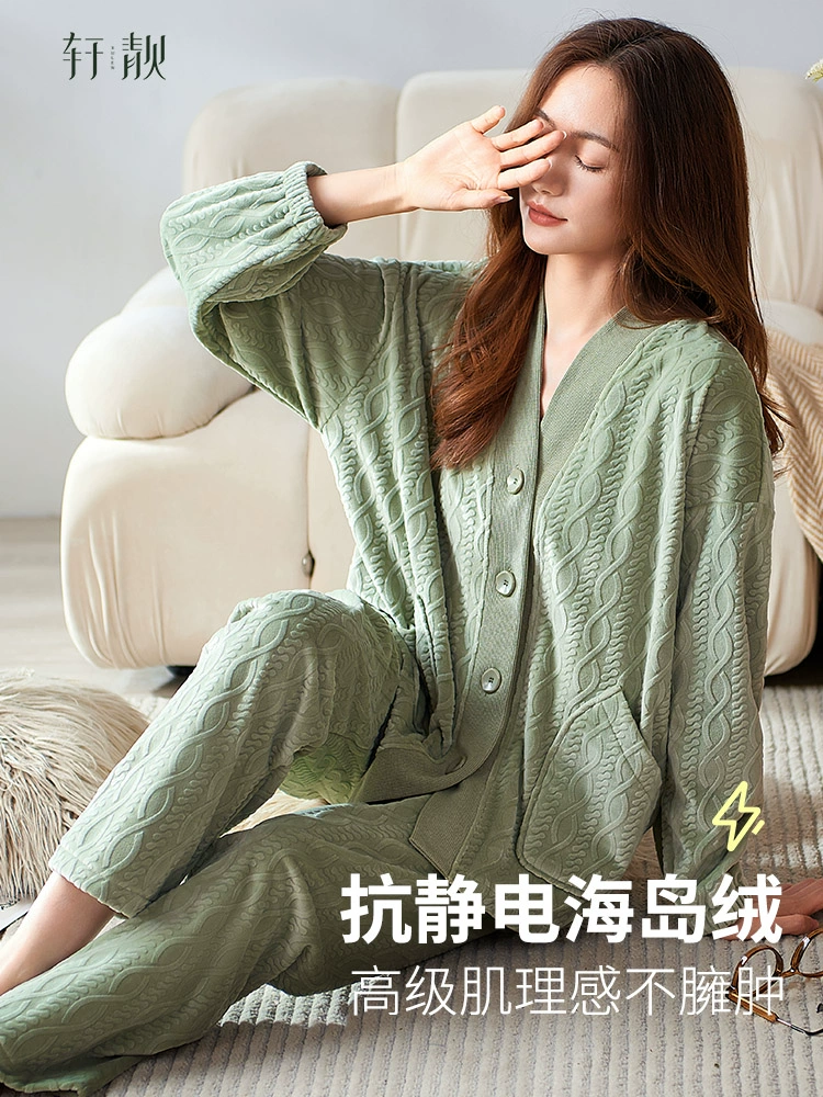 بيجامة Xuanliang Island المخملية للنساء للربيع والخريف بالإضافة إلى مخملية بأكمام طويلة دافئة من المخمل المرجاني ملابس منزلية شتوية مقاس كبير