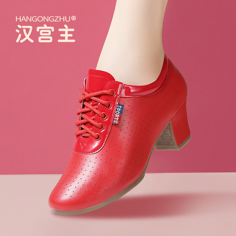 أحذية رقص لاتينية احترافية من الجلد الطبيعي باللون الأحمر، أحذية للمعلمين بكعب مكتنز منتصف العام، أحذية رقص مربعة ناعمة من الأسفل للنساء