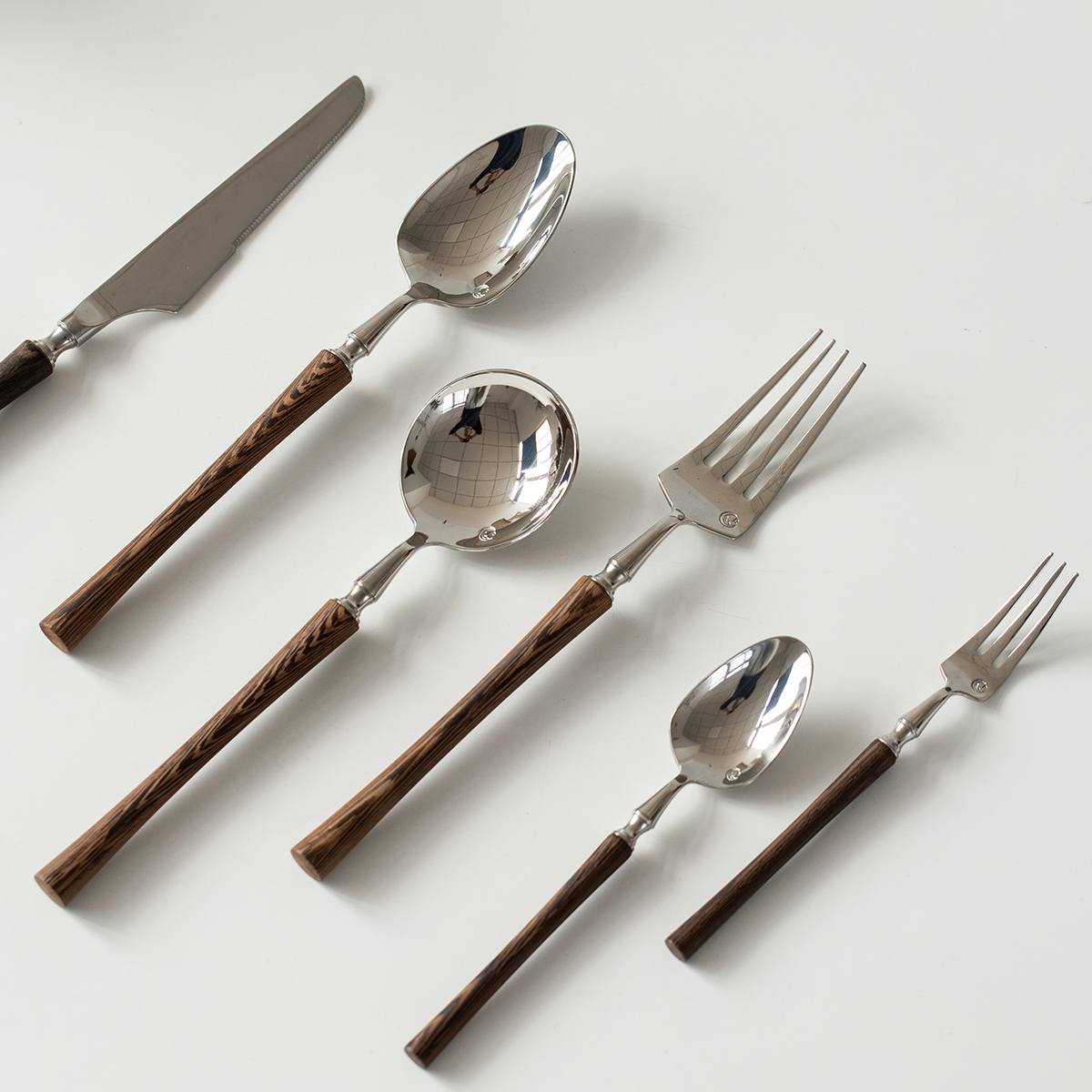 MJ43 خمر مقبض من الخشب الصلب سكين لحوم شوكة المعكرونة شوكة الحلوى ملعقة قهوة 304 الفولاذ المقاوم للصدأ المتعثرة سكين شوكة ملعقة الغرب