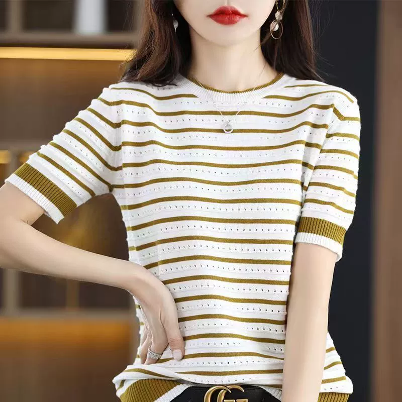 [100 Lyocell Tencel] قميص بولو نسائي كاجوال فضفاض صيفي مخطط ذو طية صدر السترة متباين الألوان