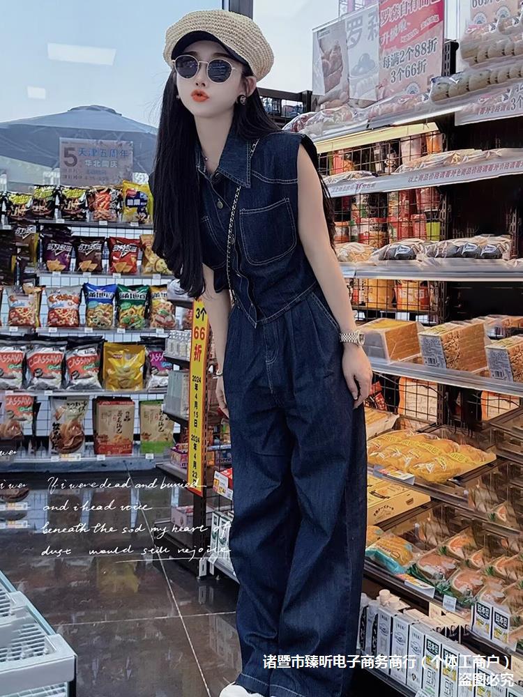 عارضة أزياء الدنيم دعوى المرأة الصيف نمط جديد الرجعية أكمام قميص مستقيم واسعة الساق السراويل قطعتين مجموعة