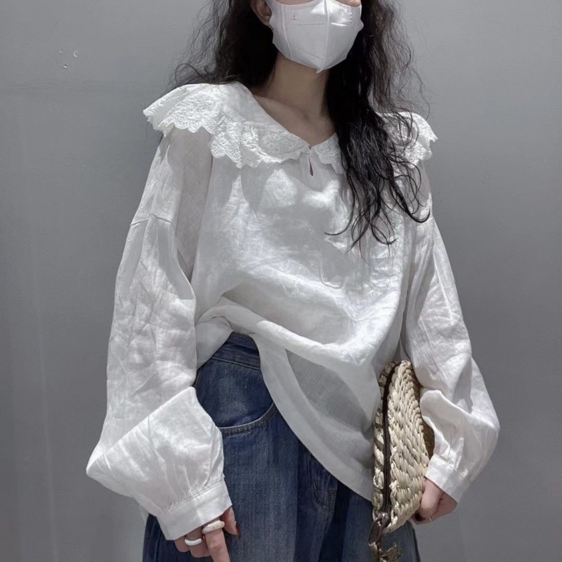 قميص بياقة الدمية للسيدات 2024 على الطراز الكوري أنيق جديد بتصميم جميل وقميص أبيض واقي من الشمس