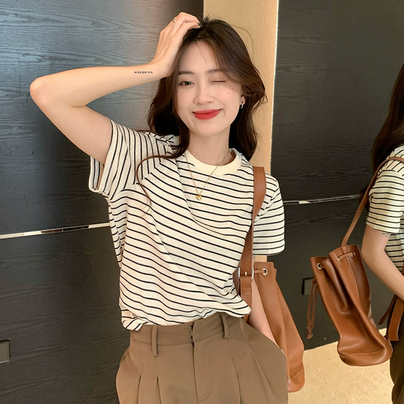 تي شيرت فضفاض مخطط برقبة دائرية وأكمام قصيرة