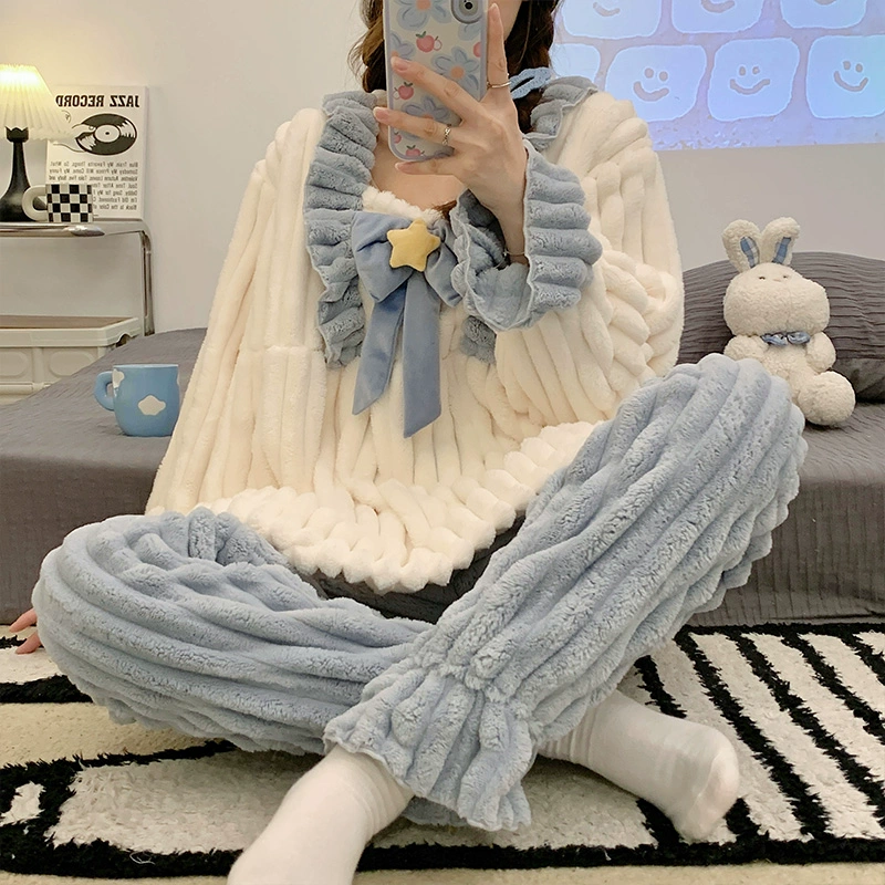 بيجامة على شكل فيونكة للنساء للخريف والشتاء، مخملية سميكة دافئة، مخملية مرجانية، على الطراز الكوري، مجموعة ملابس منزلية للفتيات الجميلات