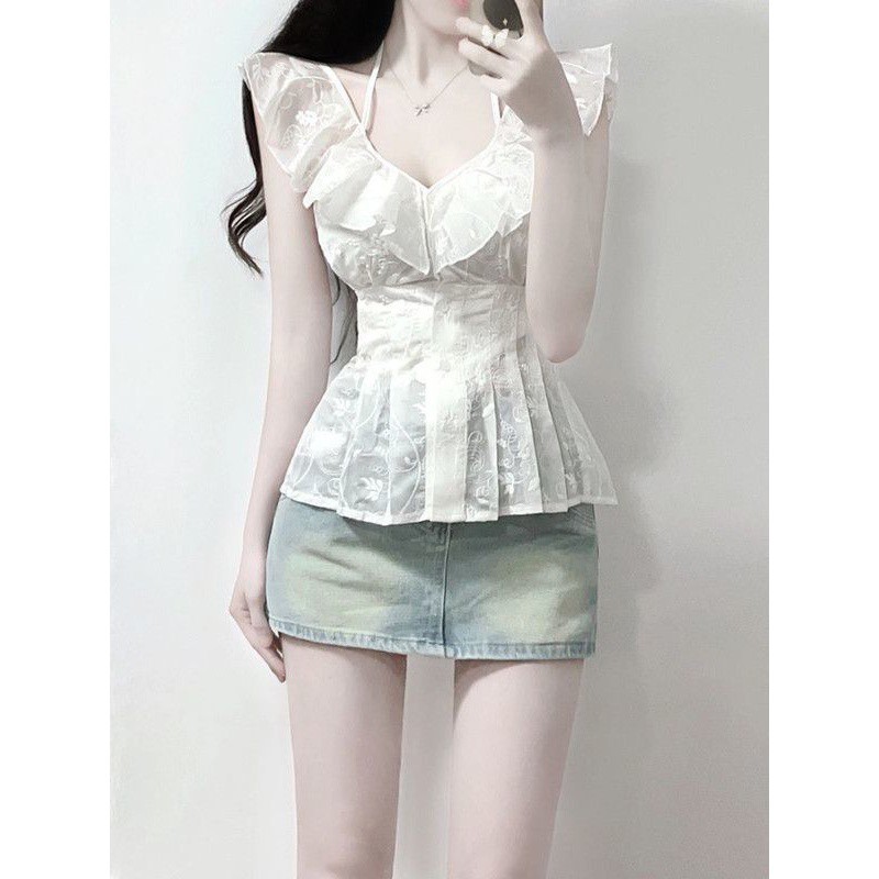 2024 صيف جديد لطيف النمط الفرنسي ريترو رومانسي أنيق تكدرت الخصر قميص المرأة الرغبة النقية نمط
