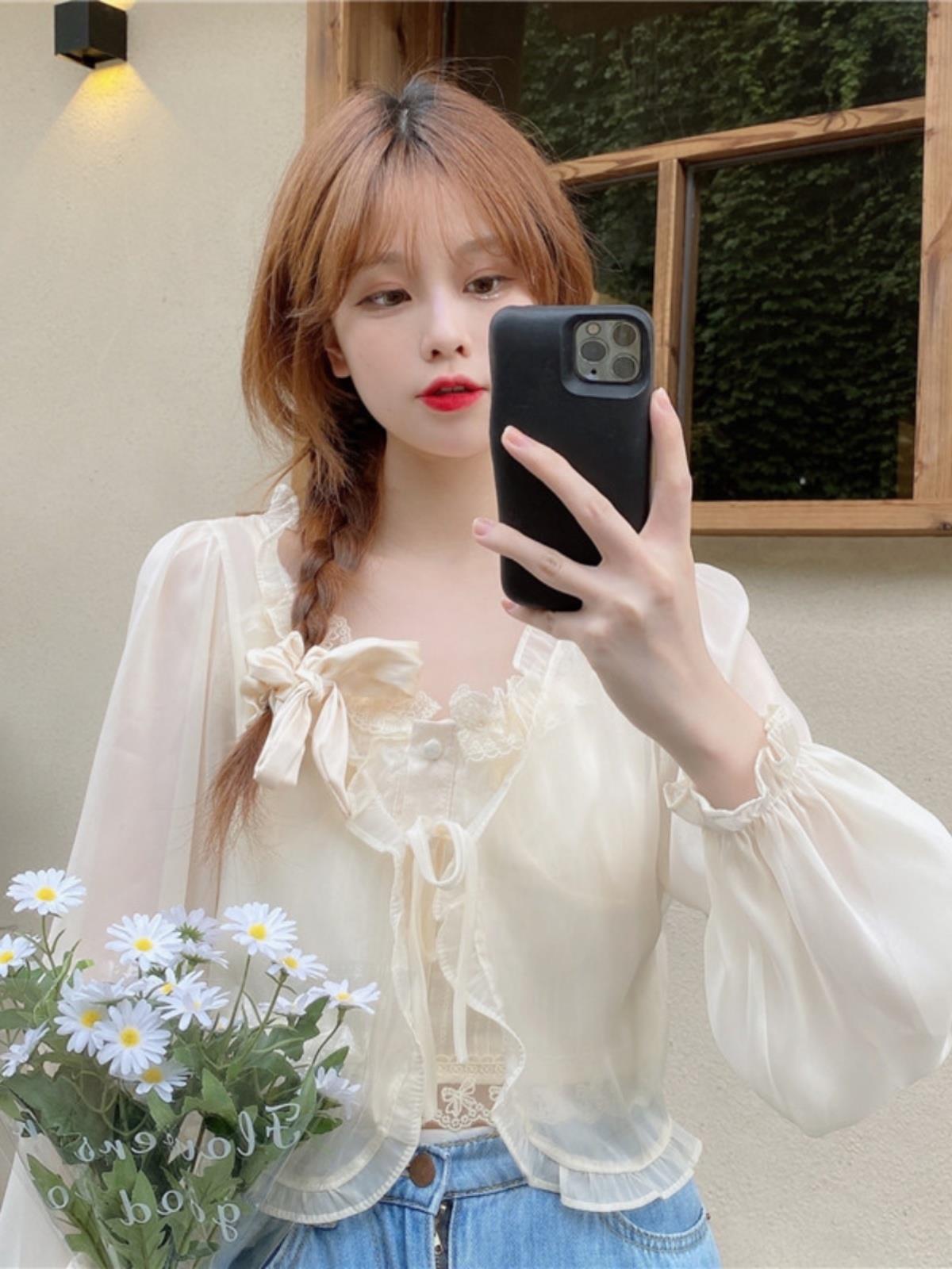 الأمازون AliExpress جديد أوائل الخريف فضفاض الجبهة قصيرة الظهر طويل الدانتيل متابعة قميص نحيف
