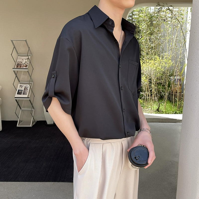 2024 الصيف الحرير الجليدي الرقيق قصير القميص القميص من الرجال فضفاضة وسقوط كتف خمسة أزمة قميص رفيع المستوى رفيع المستوى