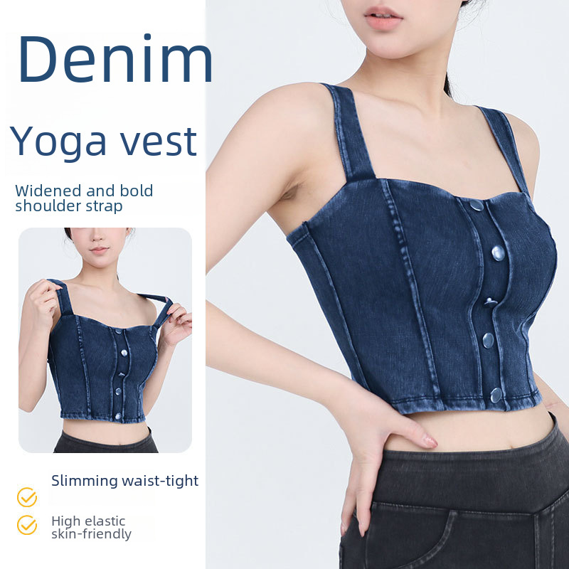 سترة يوجا للياقة البدنية من الدنيم الصناعي للنساء عالية المرونة على شكل حرف U مع وسادة صدر للتخسيس بإبزيم معدني حبال رياضية غير رسمية