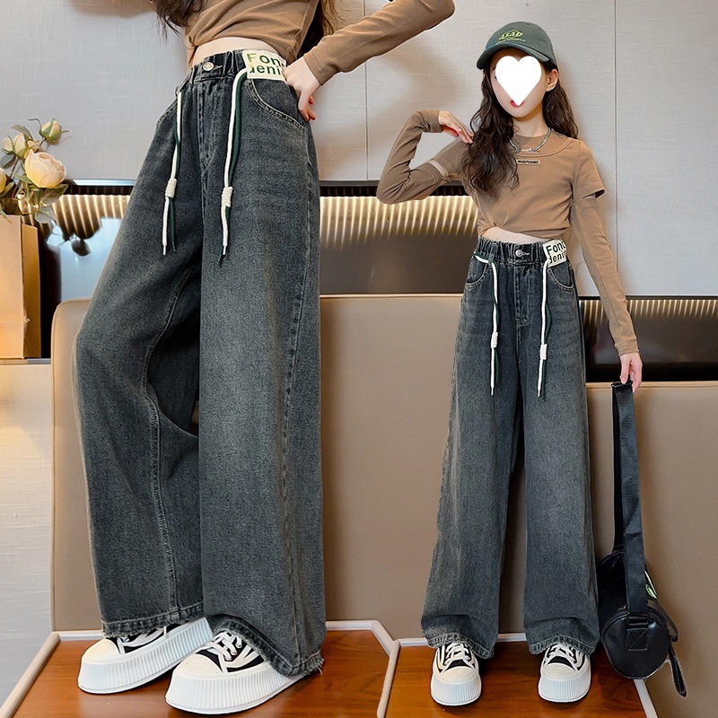 جينز بناتي بساق مستقيمة 2024 نمط جديد للأطفال متوسط وكبير مبطن بالصوف سميك وواسع الساق سروال فضفاض غير رسمي للخريف والشتاء