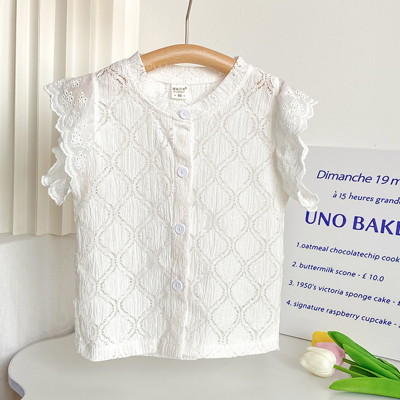 الكورية نمط ملابس أطفال فتاة تحلق كم تنفس سترة الصيف الكورية نمط النمط الغربي الحلو الدانتيل محبوك أعلى 0038