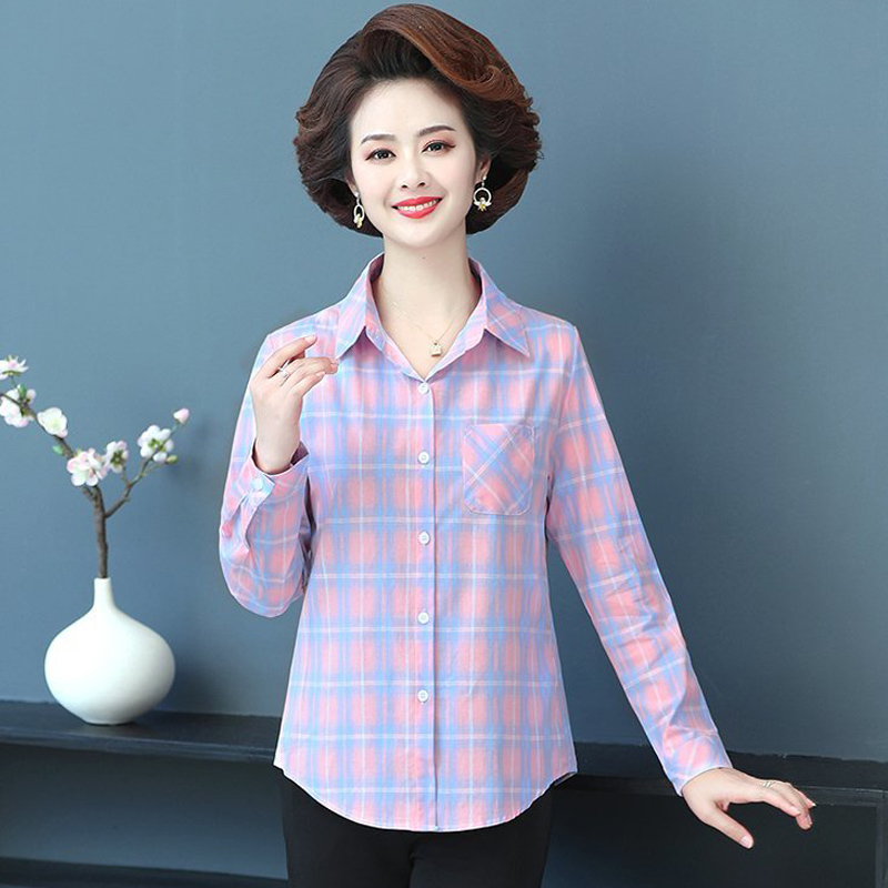 ملابس الربيع والخريف في منتصف العمر قميص نسائي بأكمام طويلة على الطراز الغربي ملابس علوية منقوشة في منتصف العمر قميص صيفي من القطن للأم في منتصف العمر