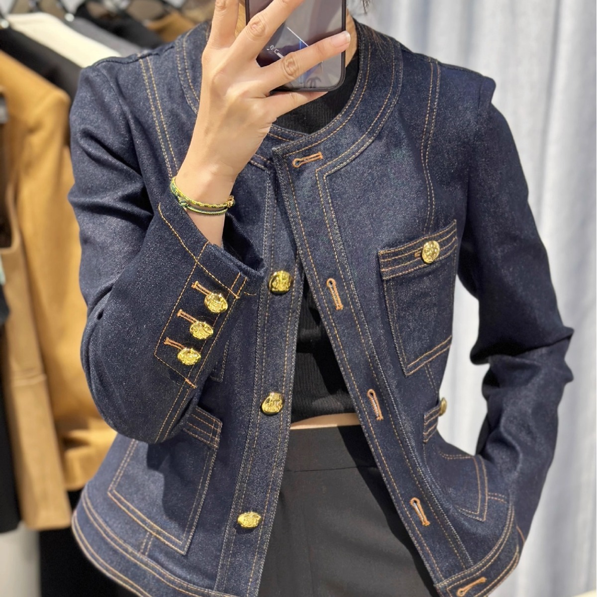 معطف قصير جديد من الدنيم عالي الجودة لعام 2023 للسيدات على طراز شانيل بألوان متباينة وأزرار ذهبية بخط مشرق