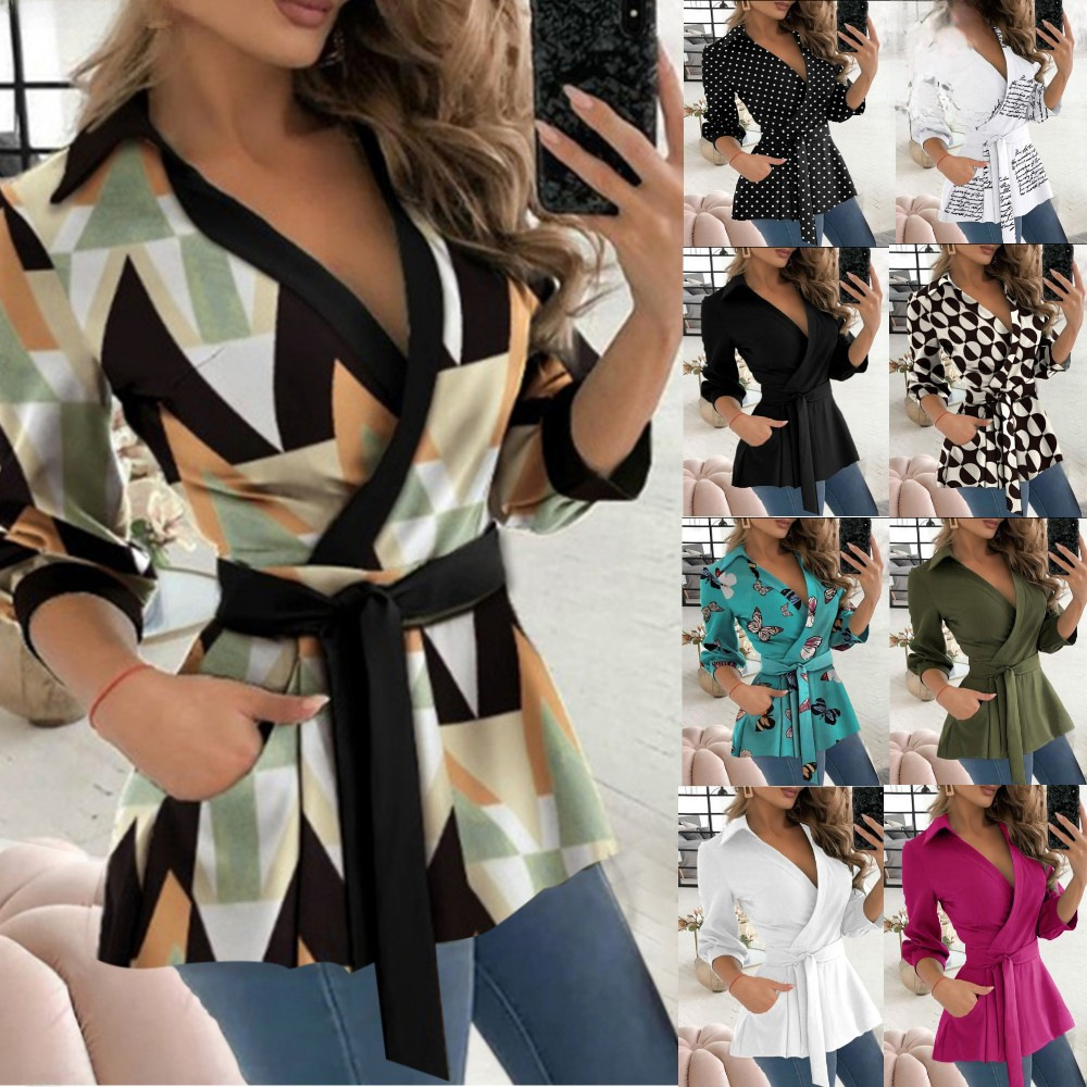 2023 محطة مستقلة ترغب في أمازون خريف شعبي جديد قميص مطبوع بأكمام طويلة ورقبة على شكل حرف V للنساء