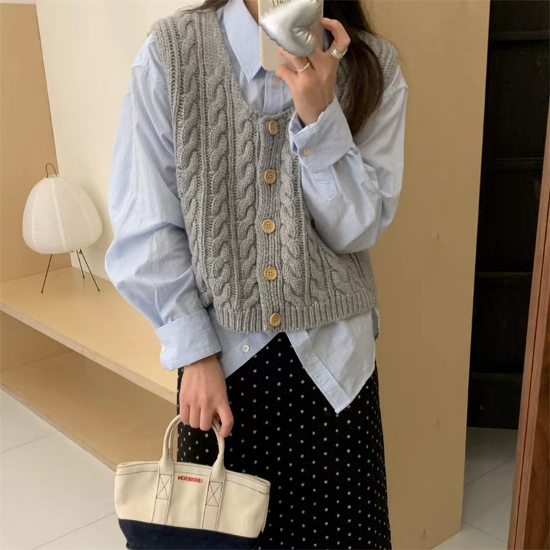 لقطة حقيقية خمر تويست منخفضة الرقبة سميكة محبوك سترة المرأة الربيع والخريف جديد مكدسة واحدة الصدر بلوزة عادية سليم