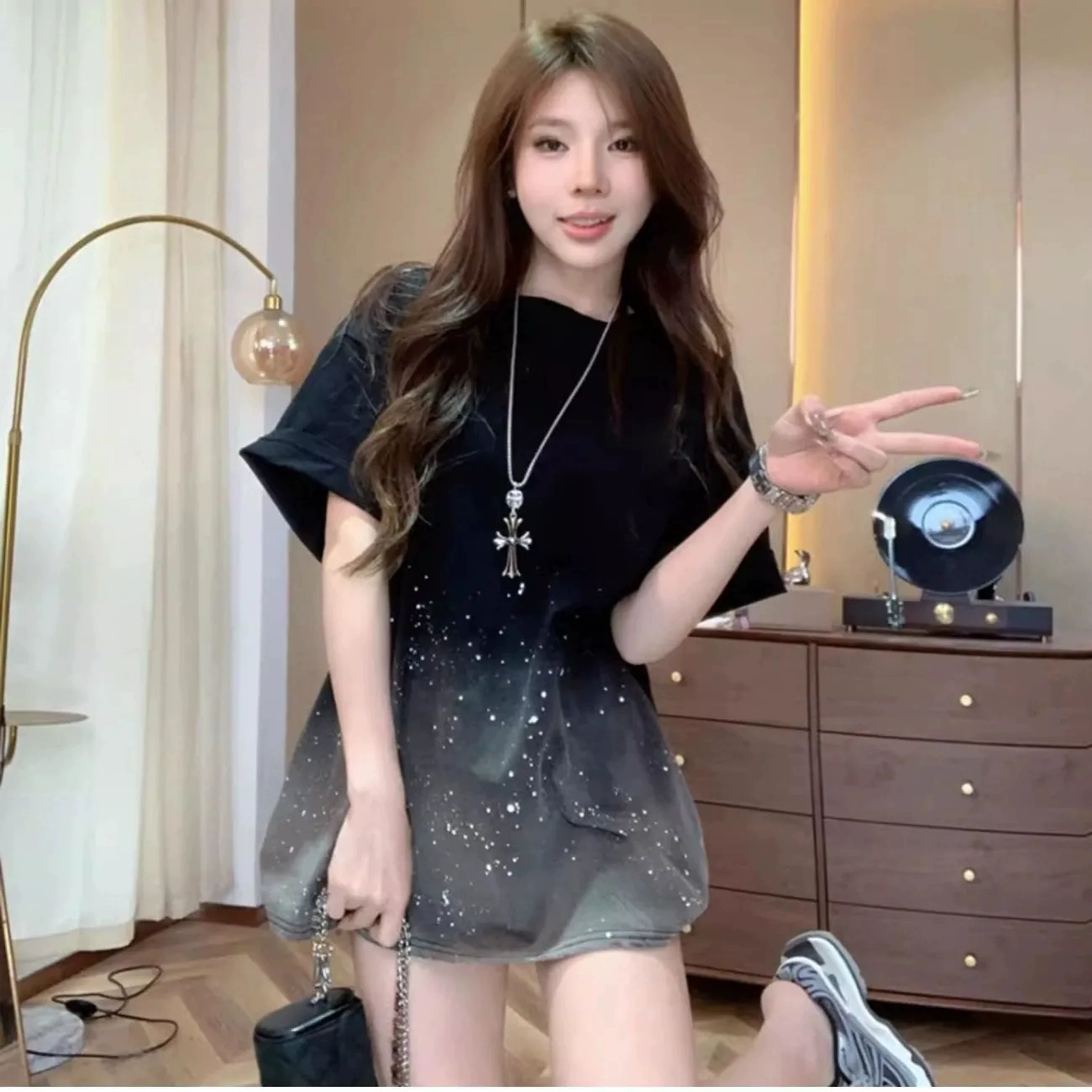 الدهون MM كبيرة الحجم التدرج في منتصف الطول طويل فضفاضة قصيرة t -sleived أنثى 300 رطل من السترات المنخفضة الجديدة اختفت وصب