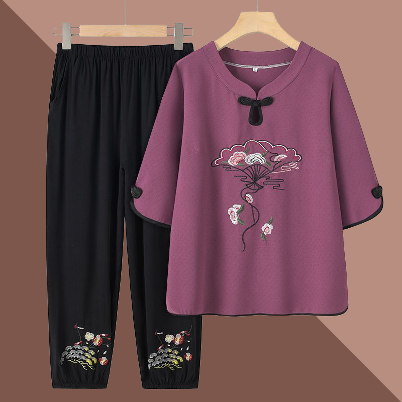 بدلة منتصف العمر وكبار السن ملابس الجدة الصيفية ملابس صيفية للأم متوسطة الأكمام لكبار السن تبلغ من العمر 60 عامًا وامرأة تبلغ من العمر 70 عامًا بدلة تانغ