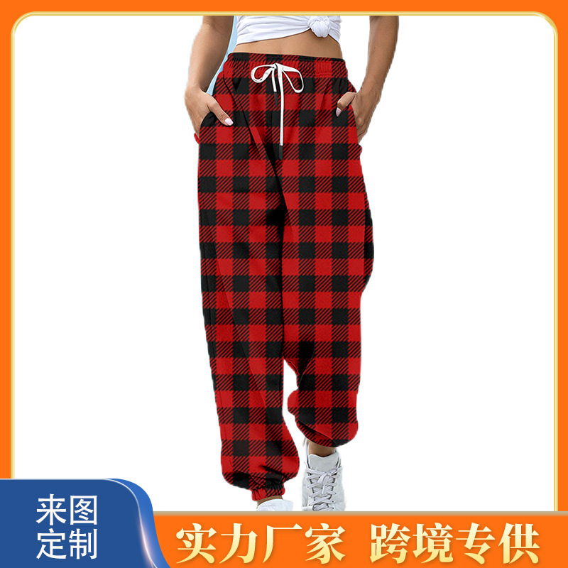 سراويل رياضية نسائية أوروبية وأمريكية شهيرة عبر الحدود مطبوعة بنمط عيد الميلاد سراويل رياضية فضفاضة غير رسمية برباط للسيدات