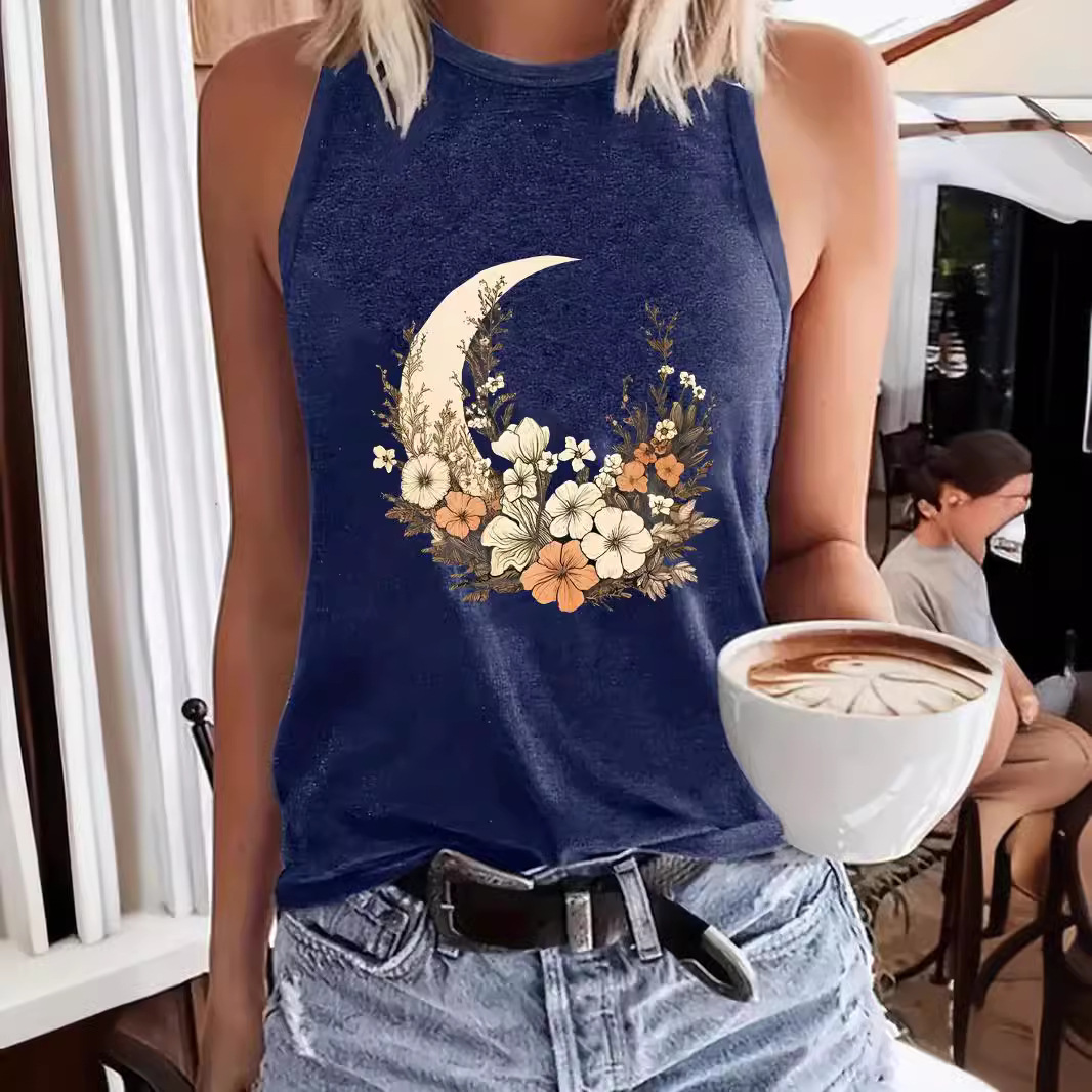 أمازون هوت مون فلاور مطبوعة للربيع والصيف بدون أكمام تي شيرت برقبة مستديرة سترة التجارة الخارجية للنساء