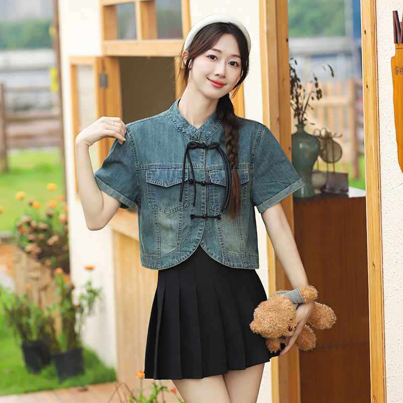 سترة ريل شوت صيفية جديدة على الطراز الوطني بإبزيم ورباط وتصميم غير منتظم من قماش الدنيم للنساء