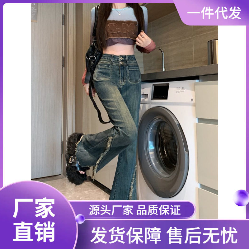 سراويل جينز نسائية ربيعية مثيرة بحواف من الفرو على طراز هونج كونج سراويل طويلة على الطراز الأمريكي عالية الشارع على شكل حدوة حصان