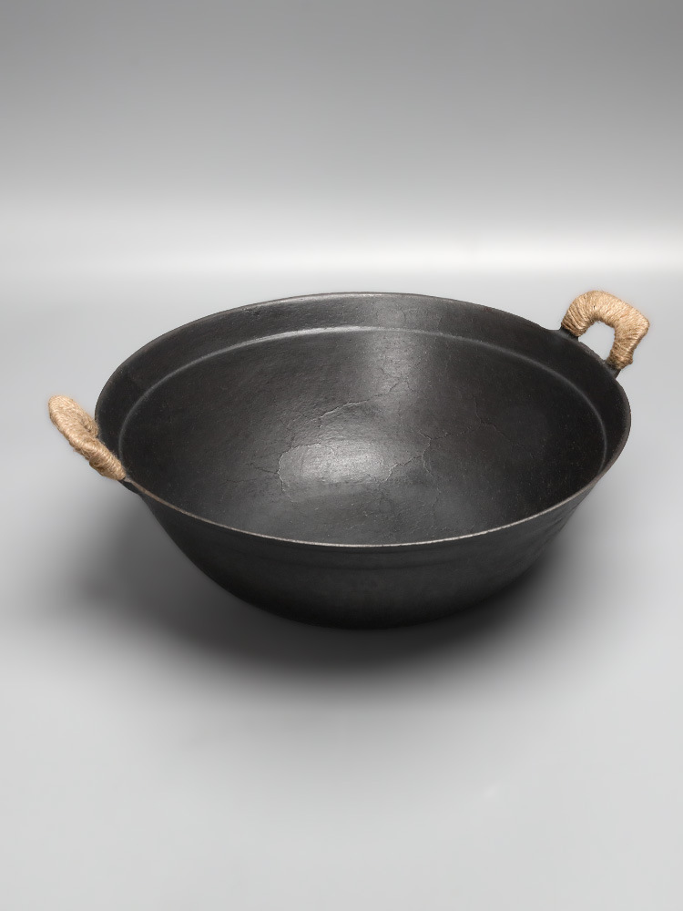 1VPK Tengzhou وعاء حديدي مزدوج الأذن على الطراز القديم مصنوع يدويًا من حديد الخنزير غير المطلي حديد زهر منزلي مستدير القاع وعاء حديد كبير