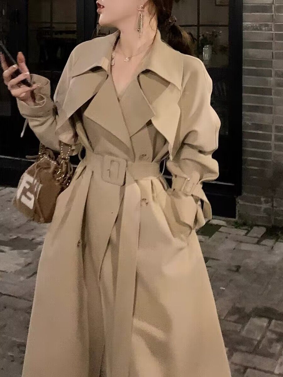 معطف كاكي للنساء متوسط الطول صغير للربيع والخريف، معطف أنيق على الطراز الكوري الجديد عالي الجودة على الطراز البريطاني
